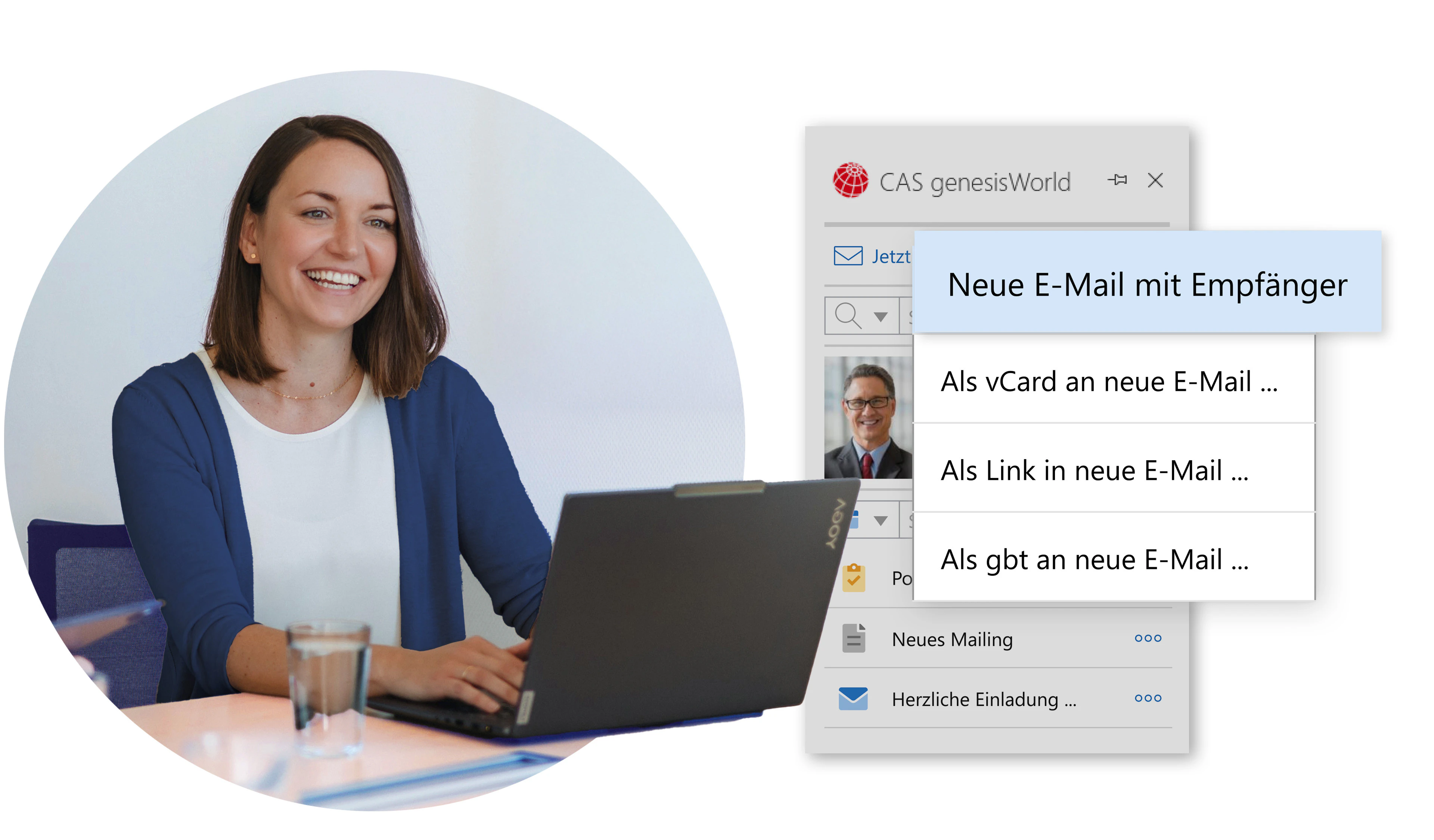 Il componente aggiuntivo CAS genesisWorld per Microsoft 365 porta i dati del tuo CRM direttamente nel tuo programma di posta elettronica. Nella barra laterale di Outlook, hai sempre il file giusto e quindi tutte le informazioni importanti a portata di mano. Puoi accedere alle funzioni centrali di CAS genesisWorld direttamente da Outlook tramite il menu azioni integrato. Questo ti consente di cercare progetti o persone, trasferire destinatari o allegare documenti dal file direttamente alla tua posta elettronica.