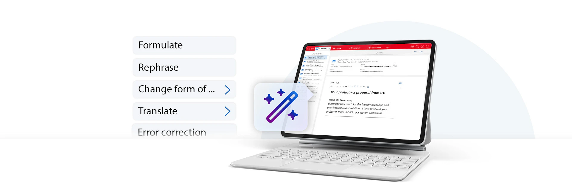 Con il modulo AI Connect, puoi aggiungere funzionalità di intelligenza artificiale intelligenti al tuo CRM. Che si tratti di creazione di testi, riassunti, regolazione della tonalità o traduzioni, AI Connect ti supporta nell'elaborazione dei contenuti in modo efficiente e mirato. Un vantaggio speciale: in combinazione con Business Process Automation, ad esempio, i testi nel tuo flusso di lavoro vengono analizzati con l'aiuto dell'intelligenza artificiale alla ricerca di parole chiave definite, al fine di selezionare dinamicamente il percorso di processo più appropriato.