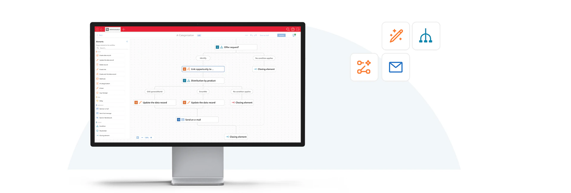 Con l'automazione dei processi aziendali in CAS genesisWorld, è possibile modellare, automatizzare e gestire processi aziendali ricorrenti, come preventivi o richieste di assistenza, senza alcuna conoscenza di programmazione. Grazie all'interfaccia drag-and-drop intuitiva, anche i processi complessi possono essere mappati in modo rapido e intuitivo con pochi clic. Una cronologia dettagliata del flusso di lavoro e indicatori chiave di prestazione significativi offrono una trasparenza completa su esecuzione, risultati e potenziali errori. Questo garantisce che i processi vengano eseguiti in modo affidabile e affidabile in ogni momento.
