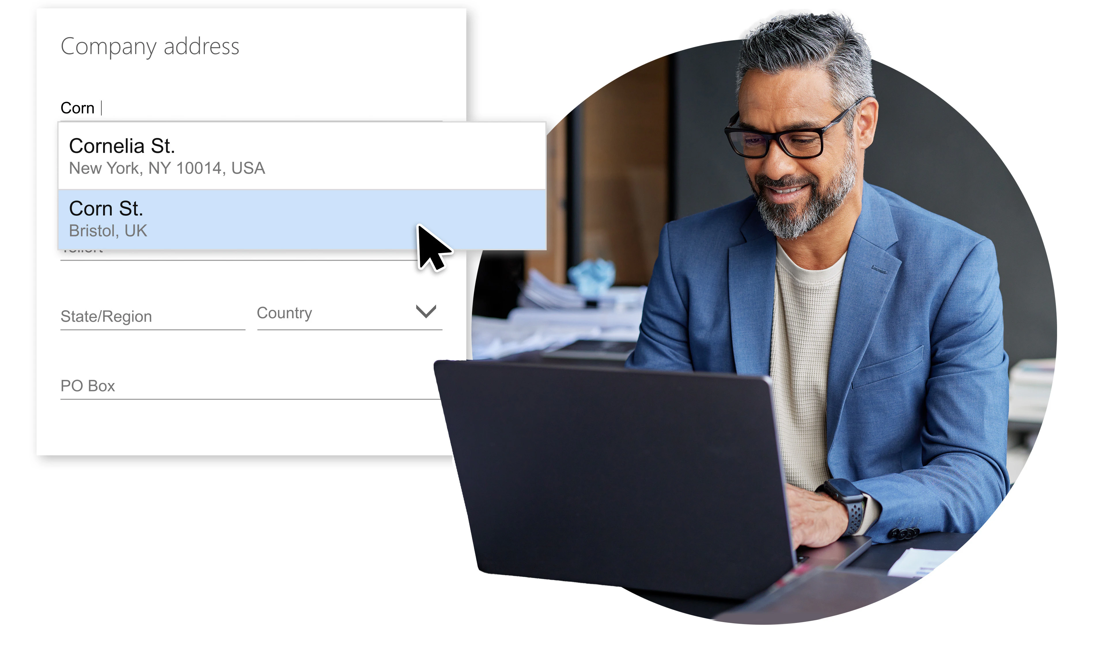 Quando si creano nuovi contatti, la funzione di completamento intelligente degli indirizzi semplifica la creazione di nuovi contatti: a partire dal terzo carattere inserito, vengono suggeriti automaticamente tutti gli indirizzi corrispondenti per il paese selezionato. L'elenco viene aggiornato in tempo reale con ogni carattere aggiuntivo inserito, secondo il collaudato principio di ricerca durante la digitazione.