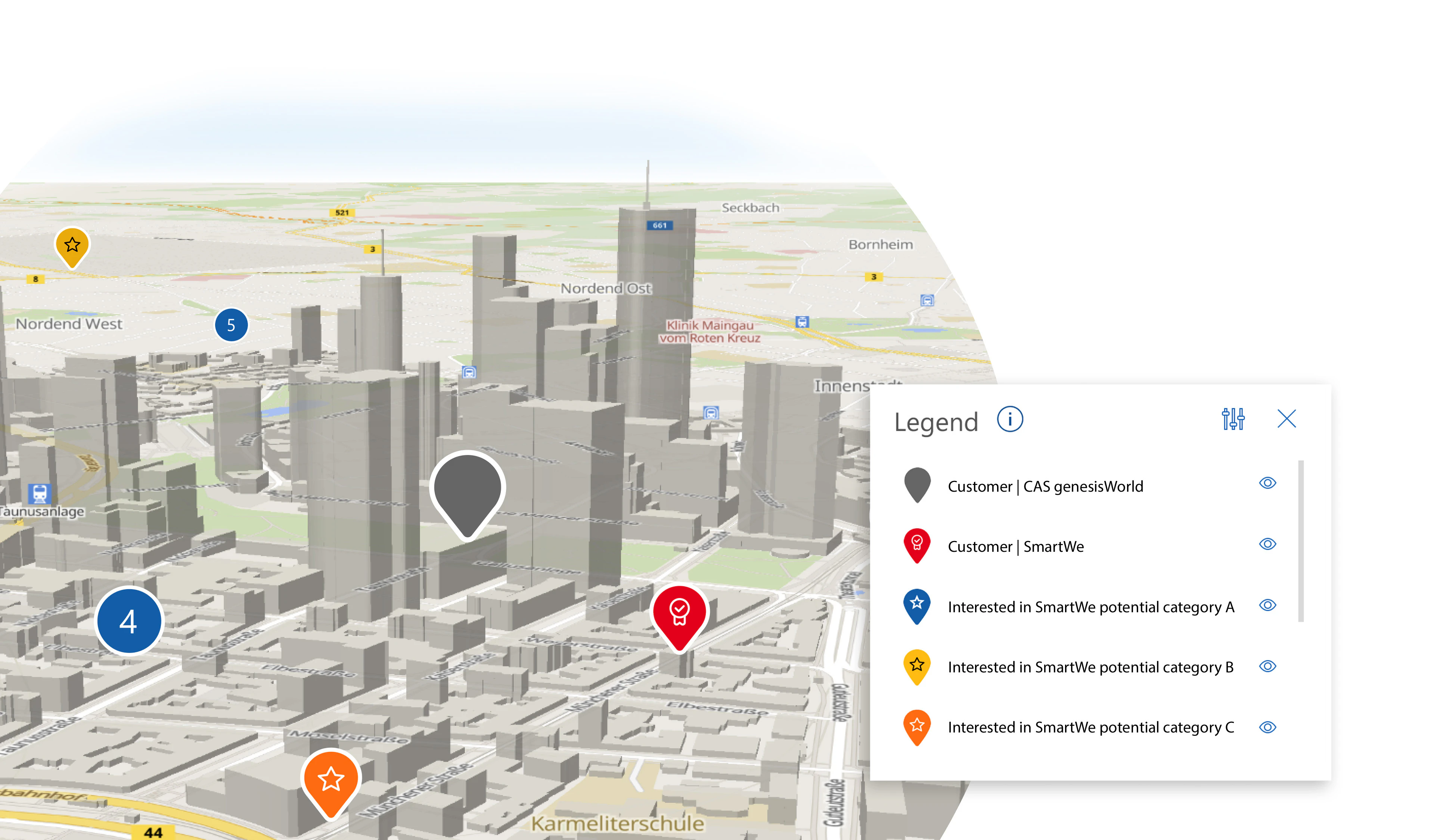 La nuova visualizzazione mappa rende l'utilizzo dei dati degli indirizzi ancora più intuitivo e visivo. L'integrazione di SmartMaps consente di visualizzare i dati CRM relativi agli indirizzi direttamente su una mappa interattiva in CAS genesisWorld. È possibile creare legende personalizzate per diverse tipologie di dati, aiutando a mantenere una visione d'insieme anche con set di dati complessi. Nuove opzioni di visualizzazione, come la vista 3D, forniscono un'immagine realistica dell'ambiente circostante, comprese le strutture degli edifici.